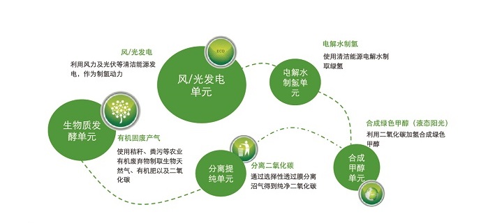 風光生物質聯合制儲氫(液態陽光)一體化碳中和技術是國能中電以國家“雙碳”目標為指引,在自身優勢的生物質能技術基礎之上,打破產業壁壘,融通產業鏈條,成功孵化的以風能、太陽能、生物質能、氫能等清潔能源為代表的一體化碳中和項目,該項目主要包括風力發電單元、電解水制氫單元、生物質發酵產氣單元、合成甲醇單元,在消納秸稈等有機固廢的同時,利用清潔能源為氫能產業提供綠色甲醇,通過能源循環利用最終實現碳中和。該項目建立了全新的清潔能源產業鏈協同利用模式,是國能中電碳中和路徑的有益實踐,也是我國能源結構重整的創新之舉。