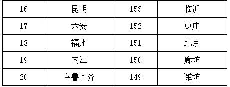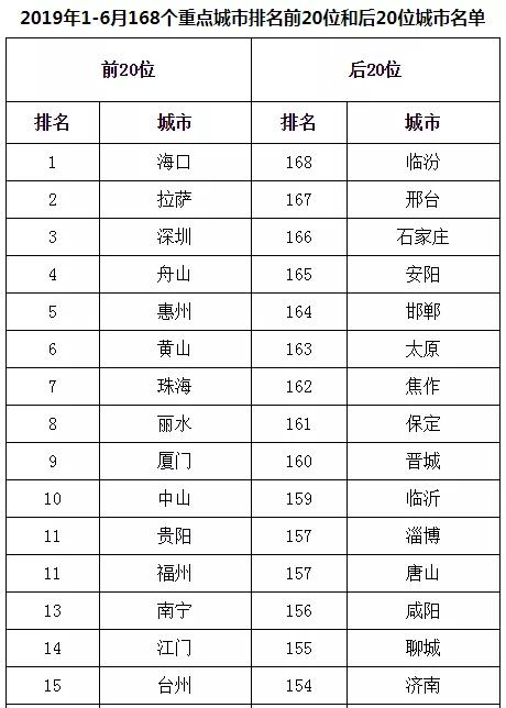 2019年1-6月,168個(gè)重點(diǎn)城市中臨汾、邢臺(tái)、石家莊市等20個(gè)城市空氣質(zhì)量相對(duì)較差(從第168名到第149名);海口、拉薩、深圳市等20個(gè)城市空氣質(zhì)量相對(duì)較好(從第1名到第20名,見附表2)。