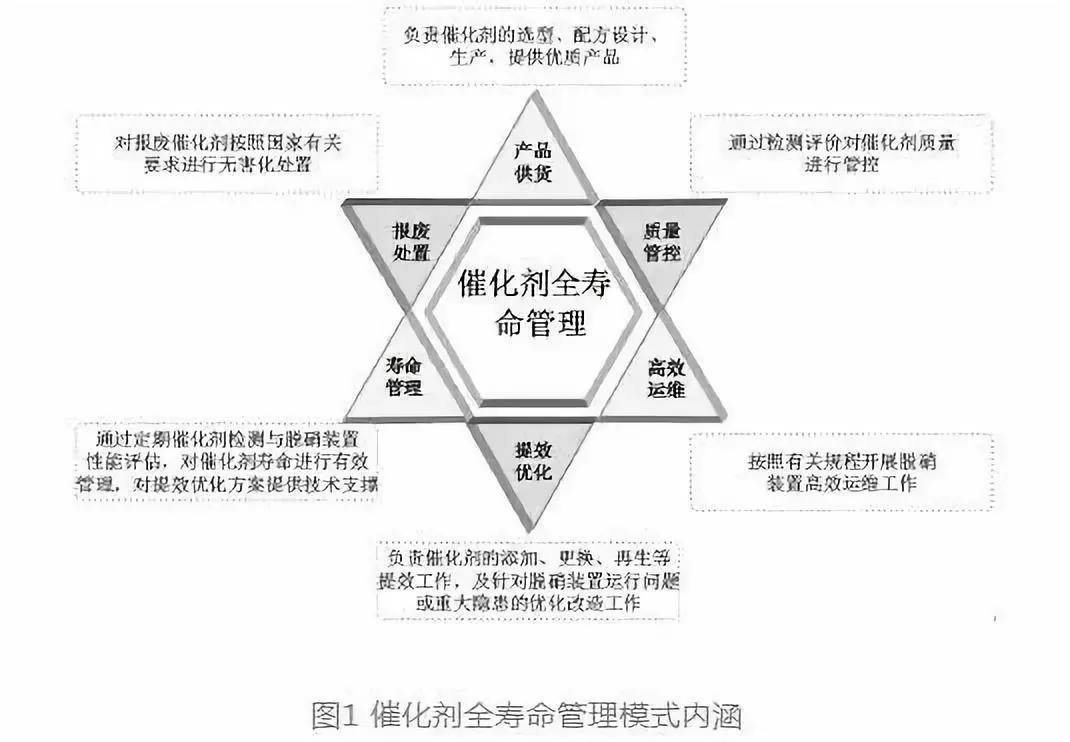 針對(duì)當(dāng)前SCR脫硝催化劑應(yīng)用現(xiàn)狀及存在問題,催化劑全壽命管理不僅應(yīng)確保催化劑采購(gòu)成本的集約化,還應(yīng)包括對(duì)脫硝裝置的高效性能管控,在此基礎(chǔ)上實(shí)現(xiàn)脫硝裝置的可靠、高效、經(jīng)濟(jì)運(yùn)行,因此催化劑全壽命管理模式應(yīng)涵蓋催化劑全壽命周期的產(chǎn)品供貨、質(zhì)量管控、高效運(yùn)維、提效優(yōu)化、壽命管理以及報(bào)廢處置六個(gè)部分。同時(shí)催化劑全壽命管理不僅以發(fā)電企業(yè)為主體單位,還應(yīng)包括催化劑廠商與第三方技術(shù)服務(wù)單位作為責(zé)任單位,通過明確各方責(zé)任,充分發(fā)揮各方專業(yè)特長(zhǎng),發(fā)電企業(yè)能夠獲得質(zhì)量穩(wěn)定可靠的催化劑產(chǎn)品與優(yōu)質(zhì)高效的技術(shù)服務(wù),減少催化劑采購(gòu)成本與運(yùn)維成本,實(shí)現(xiàn)催化劑全壽命管理的效益最大化。