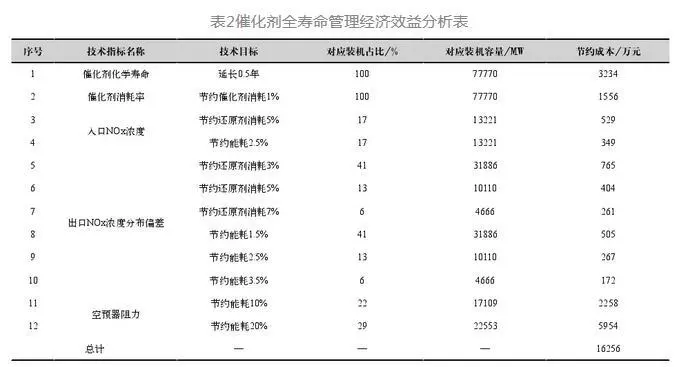 以某1000MW機(jī)組為例,假設(shè)能夠?qū)⒋呋瘎┗瘜W(xué)壽命由3年延長(zhǎng)至3.5年、節(jié)約還原劑耗量5%、降低脫硝及空預(yù)器運(yùn)行阻力300Pa,則可年節(jié)約催化劑成本50萬(wàn)元、還原劑成本40萬(wàn)元、能耗(水、電、汽耗)成本160萬(wàn)元,總計(jì)可節(jié)約脫硝運(yùn)行成本250萬(wàn)元/年。假設(shè)國(guó)內(nèi)某發(fā)電集團(tuán)192臺(tái)77770MW SCR脫硝機(jī)組催化劑統(tǒng)一實(shí)施全壽命管理模式后,基于當(dāng)前運(yùn)行現(xiàn)狀,通過折算對(duì)應(yīng)裝機(jī)的催化劑采購(gòu)成本、還原劑消耗成本、能耗成本,如表2所示,可節(jié)約脫硝運(yùn)行費(fèi)用約1.63億元/年。因此全壽命管理模式實(shí)施后,將能夠有效提升脫硝裝置運(yùn)行可靠性、減少脫硝裝置運(yùn)行成本。